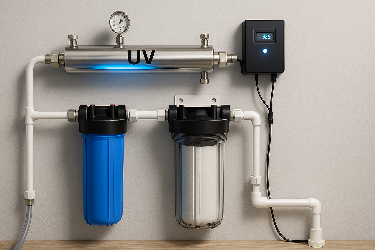 Чтобы УФ работал на 100%, воде нужна предфильтрация. Минимум — механический фильтр 5–10 мкм. Если есть запах и «хлорка», добавьте уголь. При железе/марганце — обезжелезивание. При мутности и органике — мультимедийная фильтрация.