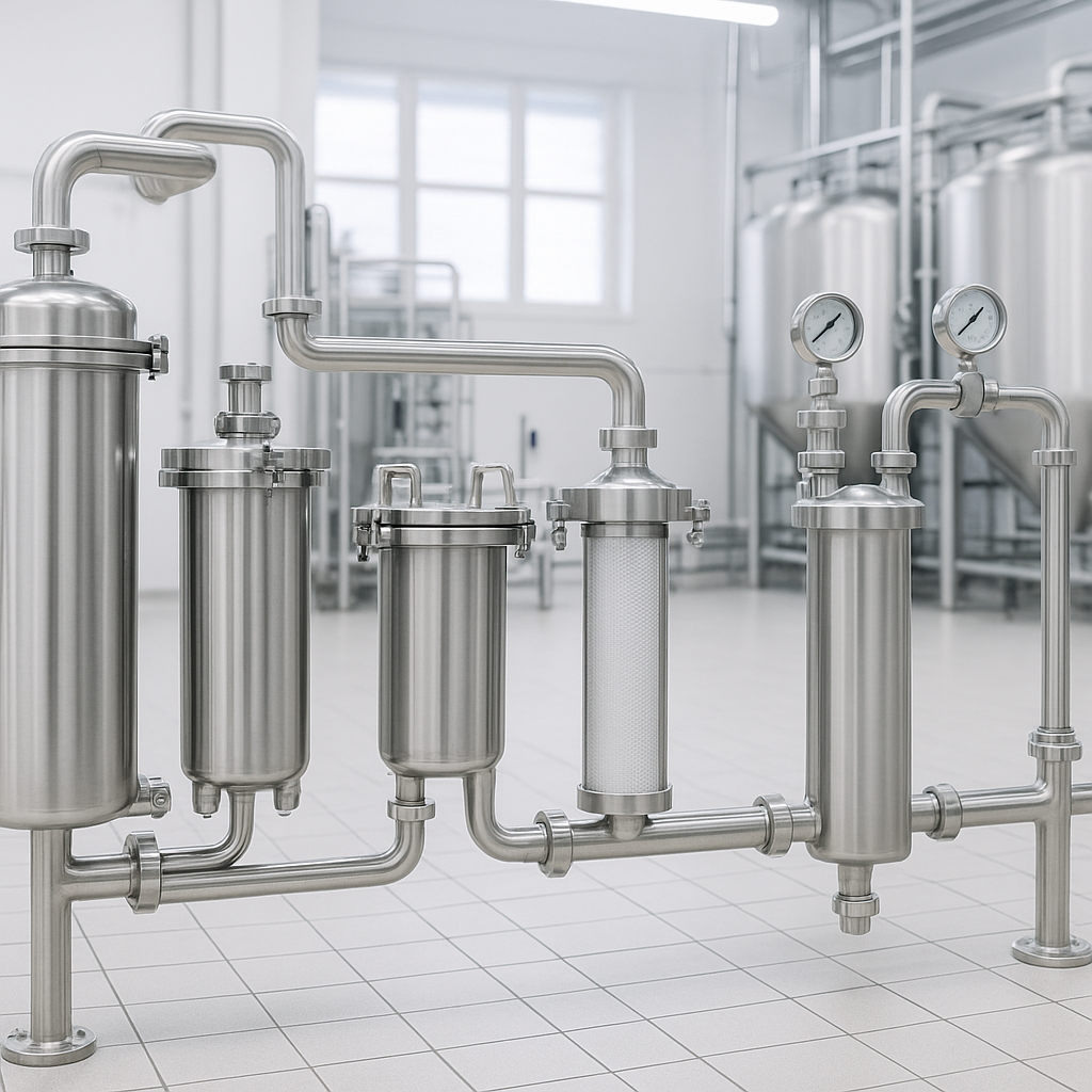 Для пищевой отрасли фильтрация — это не одна ступень, а каскад, где каждая следующая защищена предыдущей. Типовая логика: